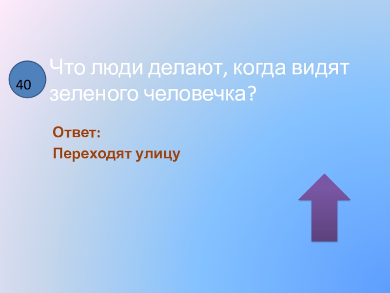 Что люди делают, когда видят зеленого человечка?Ответ:Переходят улицу40
