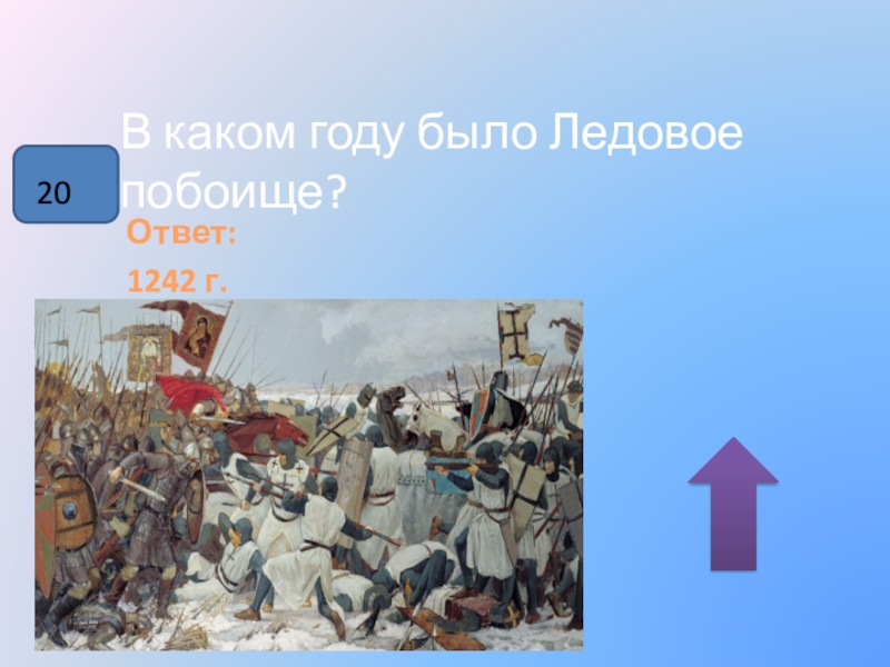 В каком году было Ледовое побоище?Ответ:1242 г.20