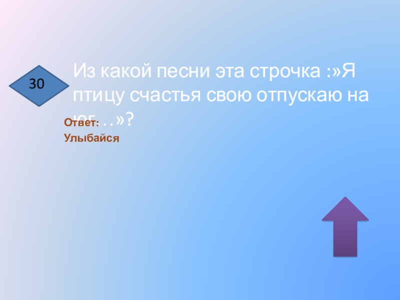 Из какой песни эта строчка :»Я птицу счастья свою отпускаю на юг…»?Ответ:Улыбайся30