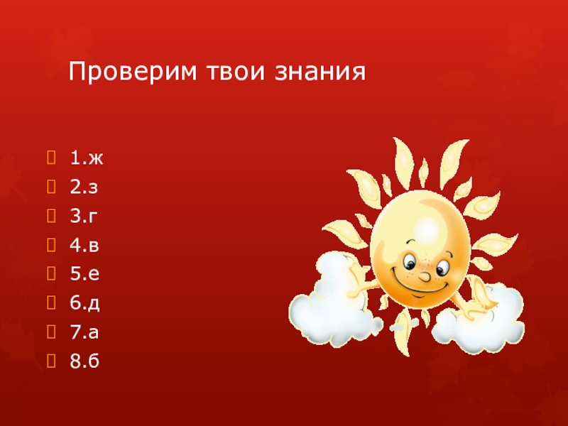 Проверим твои знания1.ж2.з3.г4.в5.е6.д7.а8.б