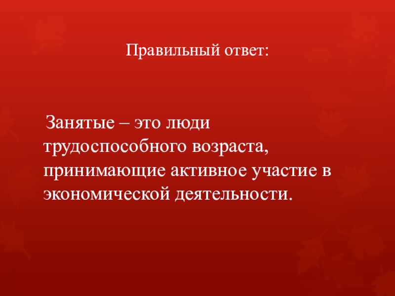Правильный ответ:   Занятые – это люди трудоспособного возраста, принимающие активное участие в экономической деятельности.