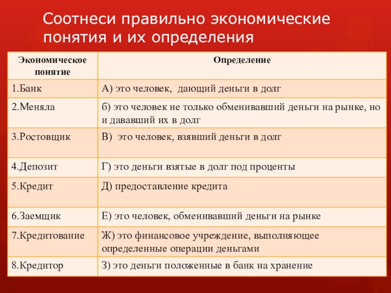 Слайд 5Соотнеси правильно экономические понятия и их определения