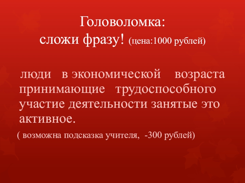 Головоломка:  сложи фразу! (цена:1000 рублей)   люди  в экономической  возраста принимающие  трудоспособного