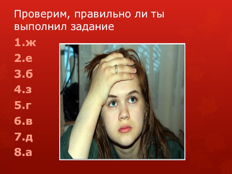 Проверим, правильно ли ты выполнил задание1.ж2.е3.б4.з5.г6.в7.д8.а