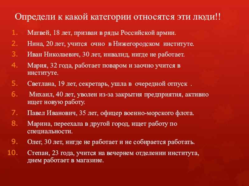 Определи к какой категории относятся эти люди!!Матвей, 18 лет, призван в ряды Российской армии.Нина, 20 лет, учится
