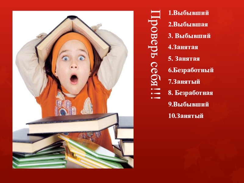 Проверь себя!!!1.Выбывший2.Выбывшая3. Выбывший4.Занятая5. Занятая6.Безработный7.Занятый8. Безработная 9.Выбывший10.Занятый