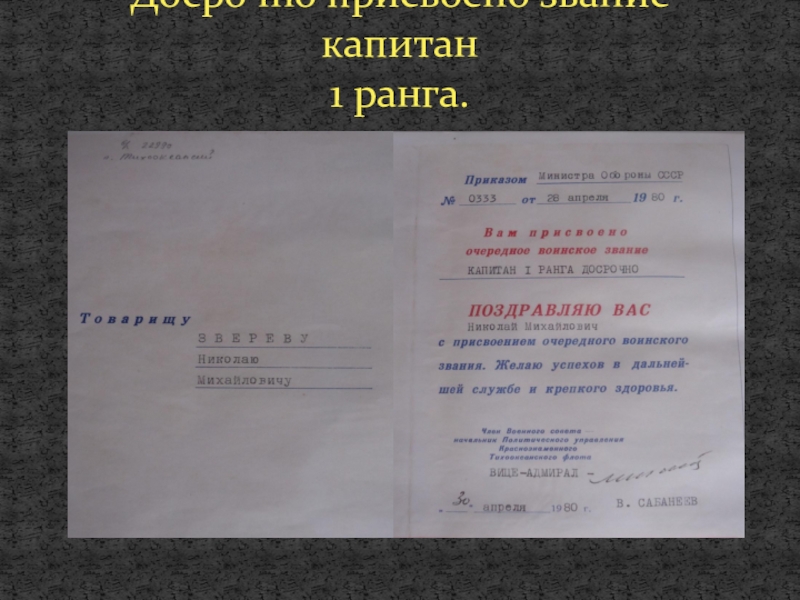 Слайд 24Досрочно присвоено звание капитан 1 ранга.