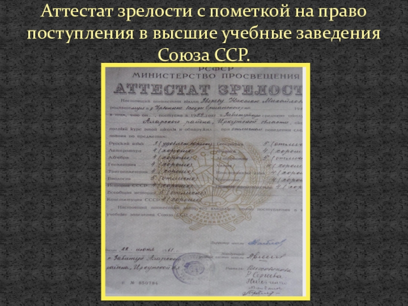 Аттестат зрелости с пометкой на право поступления в высшие учебные заведения Союза ССР.