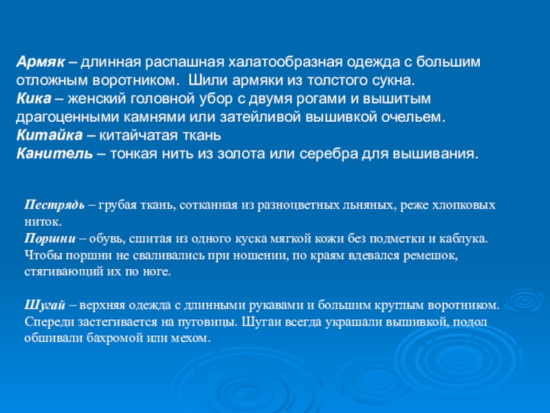 Шугай – верхняя одежда с длинными рукавами и большим круглым воротником. Спереди застегивается на пуговицы. Шугаи всегда украшали вышивкой, подол обшивали бахромой или мехом.