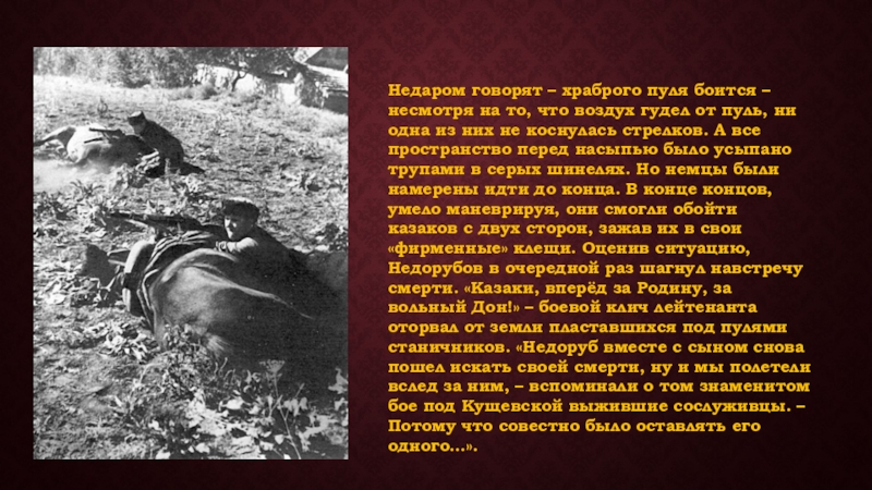 воздух гудел от пуль, ни одна из них не коснулась стрелков. А все пространство перед насыпью было усыпано трупами в серых шинелях. Но немцы были намерены идти до конца. В конце концов, умело маневрируя, они смогли обойти казаков с двух сторон, зажав их в свои «фирменные» клещи. Оценив ситуацию, Недорубов в очередной раз шагнул навстречу смерти. «Казаки, вперёд за Родину, за вольный Дон!» – боевой клич лейтенанта оторвал от земли пластавшихся под пулями станичников. «Недоруб вместе с сыном снова пошел искать своей смерти, ну и мы полетели вслед за ним, – вспоминали о том знаменитом бое под Кущевской выжившие сослуживцы. – Потому что совестно было оставлять его одного…».