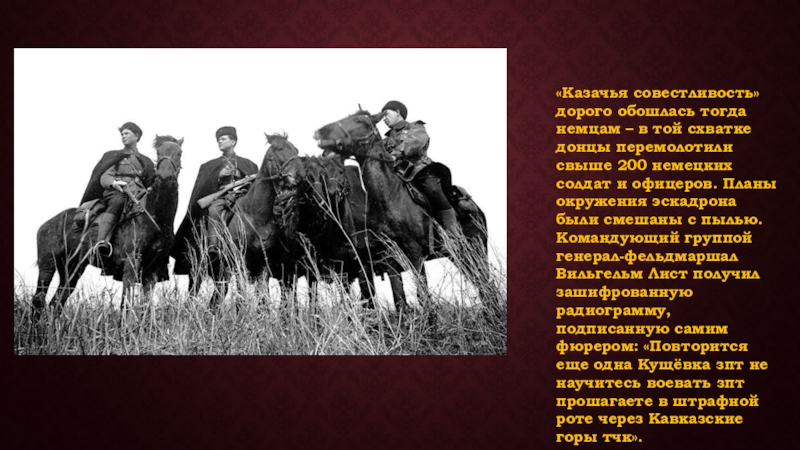 перемолотили свыше 200 немецких солдат и офицеров. Планы окружения эскадрона были смешаны с пылью. Командующий группой генерал-фельдмаршал Вильгельм Лист получил зашифрованную радиограмму, подписанную самим фюрером: «Повторится еще одна Кущёвка зпт не научитесь воевать зпт прошагаете в штрафной роте через Кавказские горы тчк».