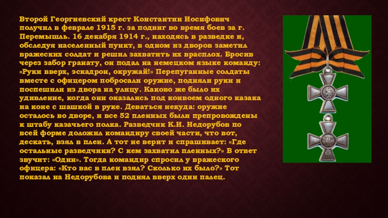Слайд 4Второй Георгиевский крест Константин Иосифович получил в феврале 1915 г. за