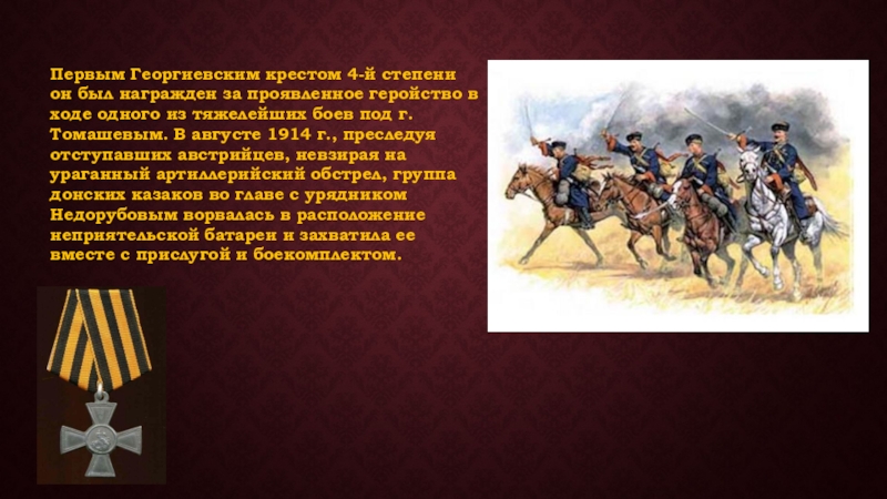 в ходе одного из тяжелейших боев под г. Томашевым. В августе 1914 г., преследуя отступавших австрийцев, невзирая на ураганный артиллерийский обстрел, группа донских казаков во главе с урядником Недорубовым ворвалась в расположение неприятельской батареи и захватила ее вместе с прислугой и боекомплектом.
