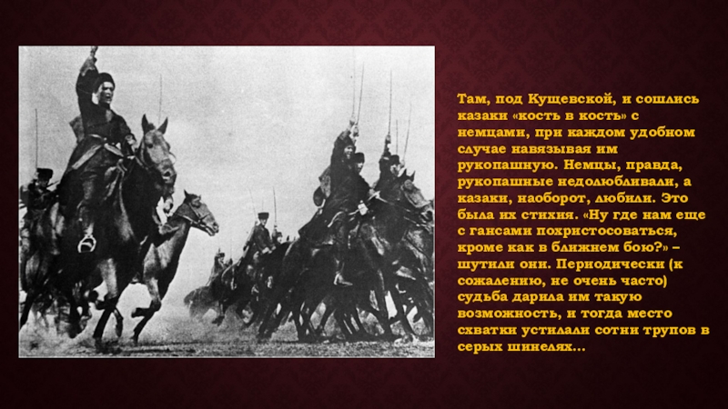 Слайд 14Там, под Кущевской, и сошлись казаки «кость в кость» с немцами,