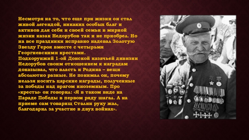 Подхорунжий 1-ой Донской казачьей дивизии Недорубов своим отношением к наградам доказывал, что власть и Родина – вещи абсолютно разные. Не понимал он, почему нельзя носить царские награды, полученные за победы над врагом иноземным. Про «кресты» он говорил: «Я в таком виде на Параде Победы в первом ряду шагал. А на приеме сам товарищ Сталин руку жал, благодарил за участие в двух войнах».