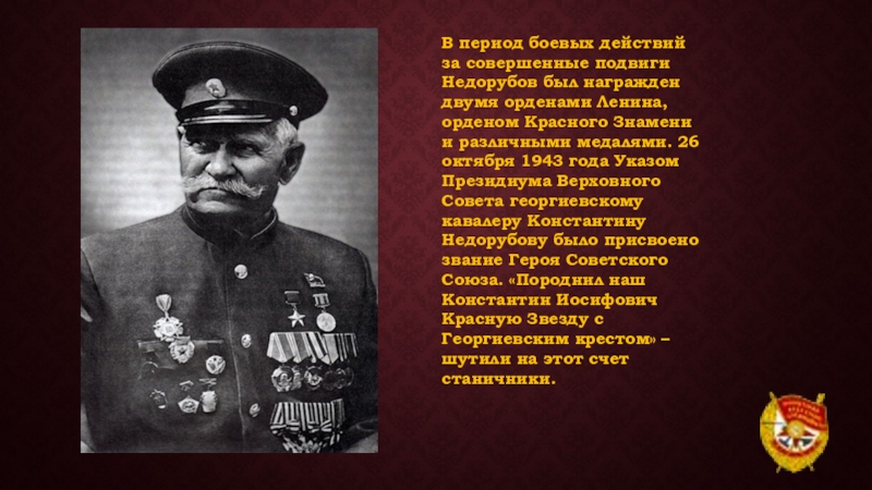 орденами Ленина, орденом Красного Знамени и различными медалями. 26 октября 1943 года Указом Президиума Верховного Совета георгиевскому кавалеру Константину Недорубову было присвоено звание Героя Советского Союза. «Породнил наш Константин Иосифович Красную Звезду с Георгиевским крестом» – шутили на этот счет станичники.