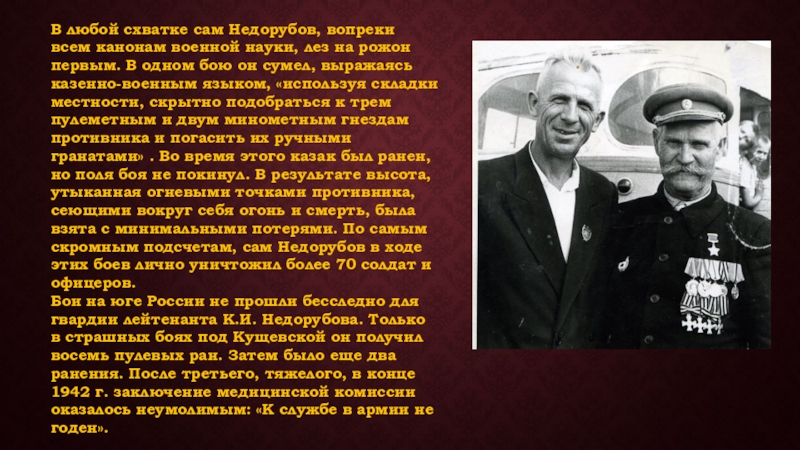 на рожон первым. В одном бою он сумел, выражаясь казенно-военным языком, «используя складки местности, скрытно подобраться к трем пулеметным и двум минометным гнездам противника и погасить их ручными гранатами» . Во время этого казак был ранен, но поля боя не покинул. В результате высота, утыканная огневыми точками противника, сеющими вокруг себя огонь и смерть, была взята с минимальными потерями. По самым скромным подсчетам, сам Недорубов в ходе этих боев лично уничтожил более 70 солдат и офицеров.