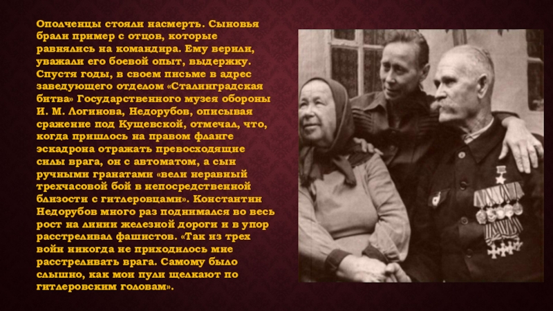 командира. Ему верили, уважали его боевой опыт, выдержку. Спустя годы, в своем письме в адрес заведующего отделом «Сталинградская битва» Государственного музея обороны И. М. Логинова, Недорубов, описывая сражение под Кущевской, отмечал, что, когда пришлось на правом фланге эскадрона отражать превосходящие силы врага, он с автоматом, а сын ручными гранатами «вели неравный трехчасовой бой в непосредственной близости с гитлеровцами». Константин Недорубов много раз поднимался во весь рост на линии железной дороги и в упор расстреливал фашистов. «Так из трех войн никогда не приходилось мне расстреливать врага. Самому было слышно, как мои пули щелкают по гитлеровским головам».