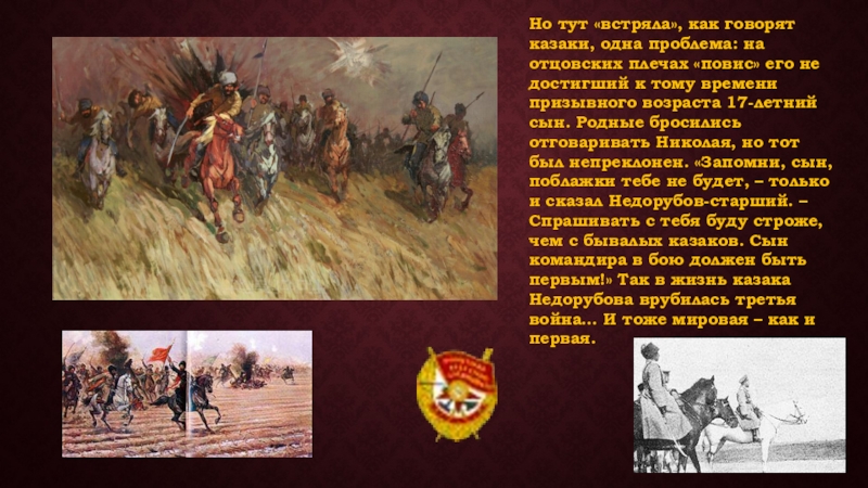 «повис» его не достигший к тому времени призывного возраста 17-летний сын. Родные бросились отговаривать Николая, но тот был непреклонен. «Запомни, сын, поблажки тебе не будет, – только и сказал Недорубов-старший. – Спрашивать с тебя буду строже, чем с бывалых казаков. Сын командира в бою должен быть первым!» Так в жизнь казака Недорубова врубилась третья война… И тоже мировая – как и первая.