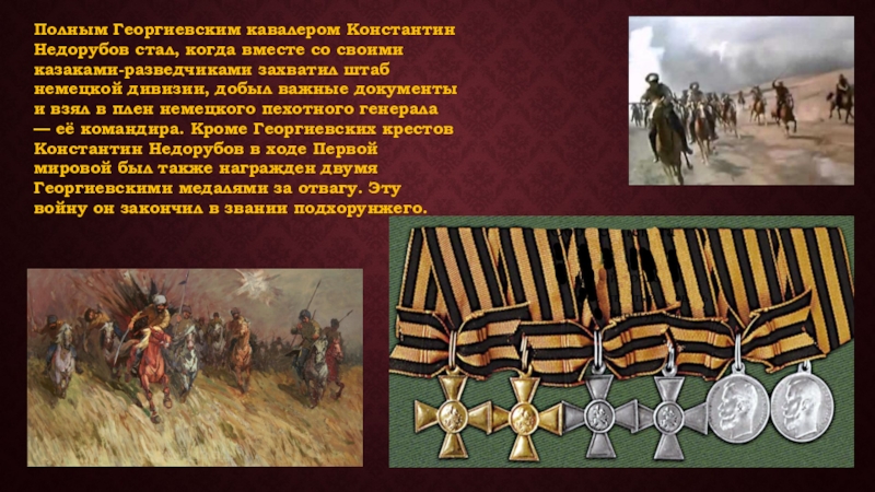 Слайд 6Полным Георгиевским кавалером Константин Недорубов стал, когда вместе со своими казаками-разведчиками