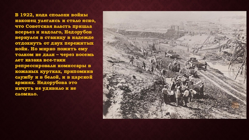 Советская власть пришла всерьез и надолго, Недорубов вернулся в станицу в надежде отдохнуть от двух пережитых войн. Но мирно пожить ему толком не дали – через восемь лет казака все-таки репрессировали комиссары в кожаных куртках, припомнив службу и в белой, и в царской армиях. Недорубова это ничуть не удивило и не сломило.