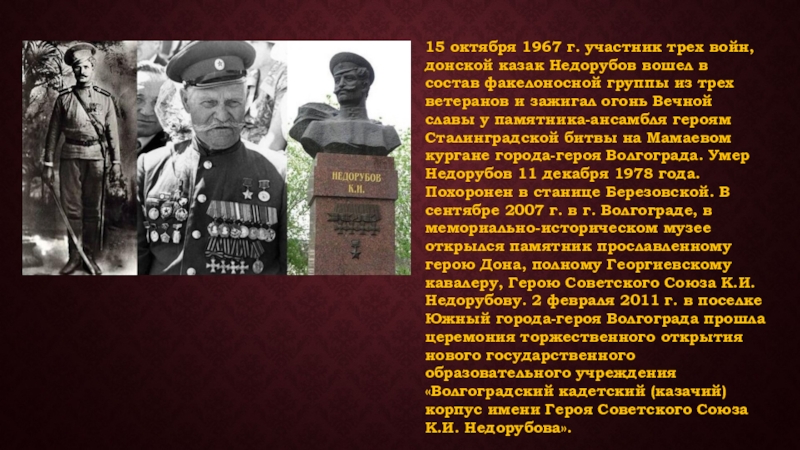 Слайд 2615 октября 1967 г. участник трех войн, донской казак Недорубов вошел