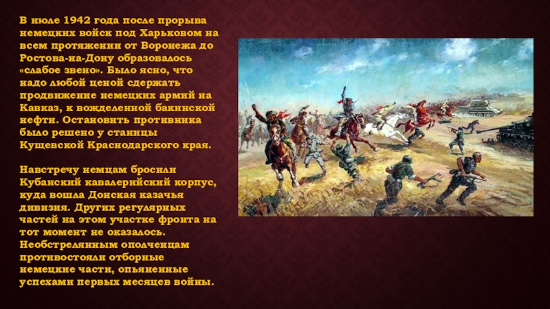 всем протяжении от Воронежа до Ростова-на-Дону образовалось «слабое звено». Было ясно, что надо любой ценой сдержать продвижение немецких армий на Кавказ, к вожделенной бакинской нефти. Остановить противника было решено у станицы Кущевской Краснодарского края.