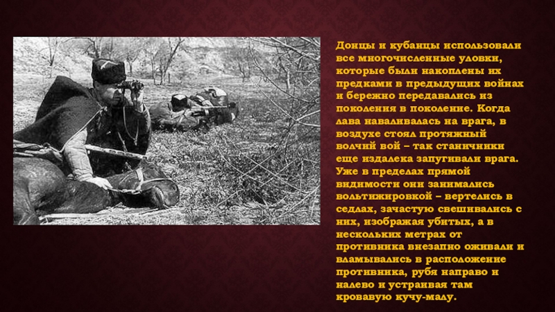 Слайд 22Донцы и кубанцы использовали все многочисленные уловки, которые были накоплены их
