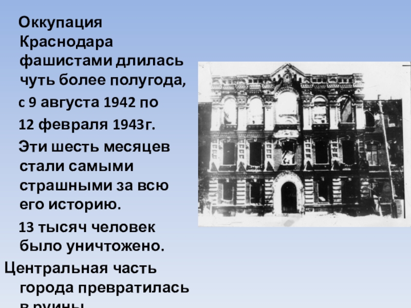 Слайд 8 Оккупация Краснодара фашистами длилась чуть более полугода,