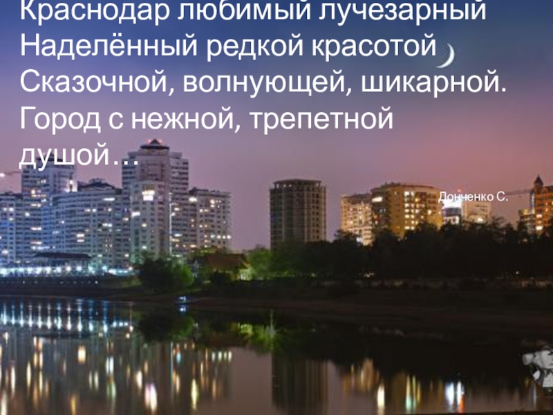 Краснодар любимый лучезарный Наделённый редкой красотой Сказочной, волнующей, шикарной. Город с нежной, трепетной душой…