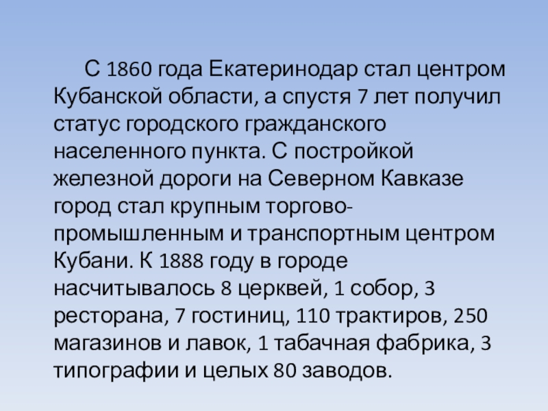 1860 года Екатеринодар стал центром Кубанской области, а спустя 7 лет получил статус городского гражданского населенного пункта. С постройкой железной дороги на Северном Кавказе город стал крупным торгово-промышленным и транспортным центром Кубани. К 1888 году в городе насчитывалось 8 церквей, 1 собор, 3 ресторана, 7 гостиниц, 110 трактиров, 250 магазинов и лавок, 1 табачная фабрика, 3 типографии и целых 80 заводов.