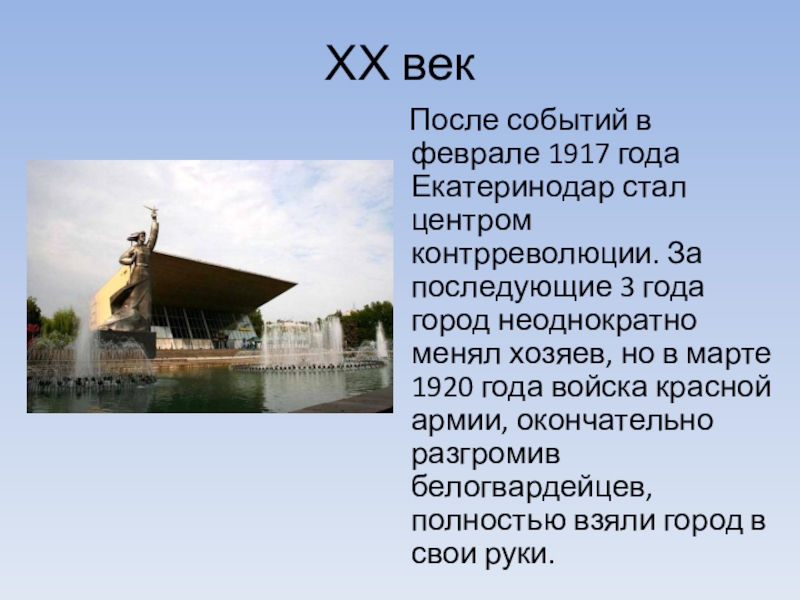 ХХ век  После событий в феврале 1917 года Екатеринодар стал центром контрреволюции. За последующие 3 года