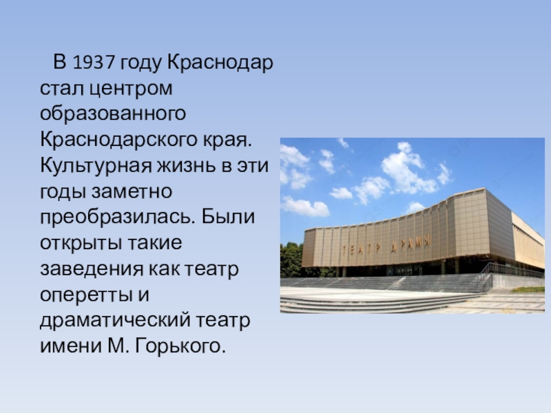 Краснодарского края. Культурная жизнь в эти годы заметно преобразилась. Были открыты такие заведения как театр оперетты и драматический театр имени М. Горького.