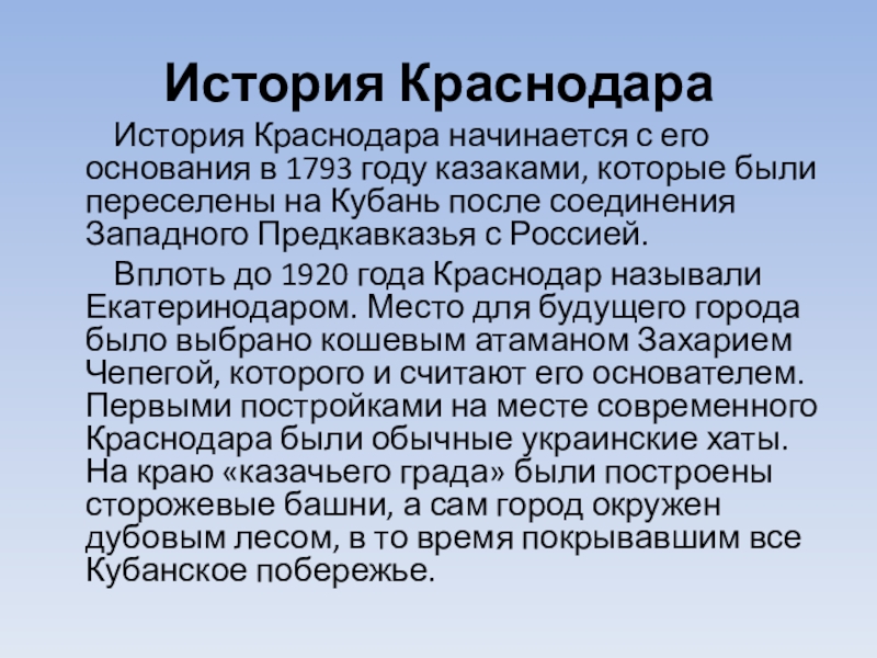 История Краснодара История Краснодара начинается с его основания в 1793 году казаками, которые были переселены на Кубань после соединения Западного Предкавказья с Россией. Вплоть до 1920 года Краснодар