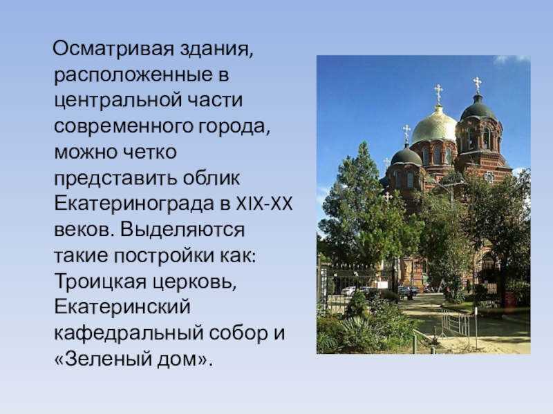четко представить облик Екатеринограда в XIX-XX веков. Выделяются такие постройки как: Троицкая церковь, Екатеринский кафедральный собор и «Зеленый дом».