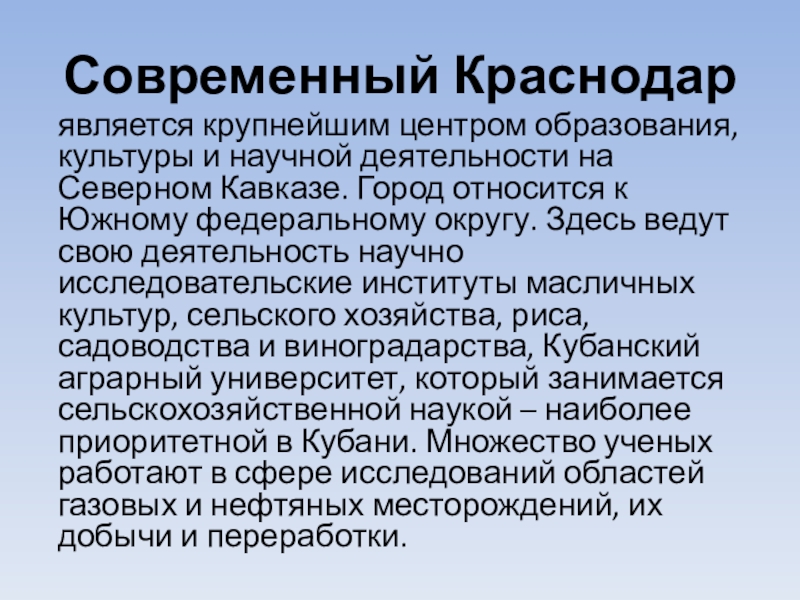 Современный Краснодар  является крупнейшим центром образования, культуры и научной деятельности на Северном Кавказе. Город относится к