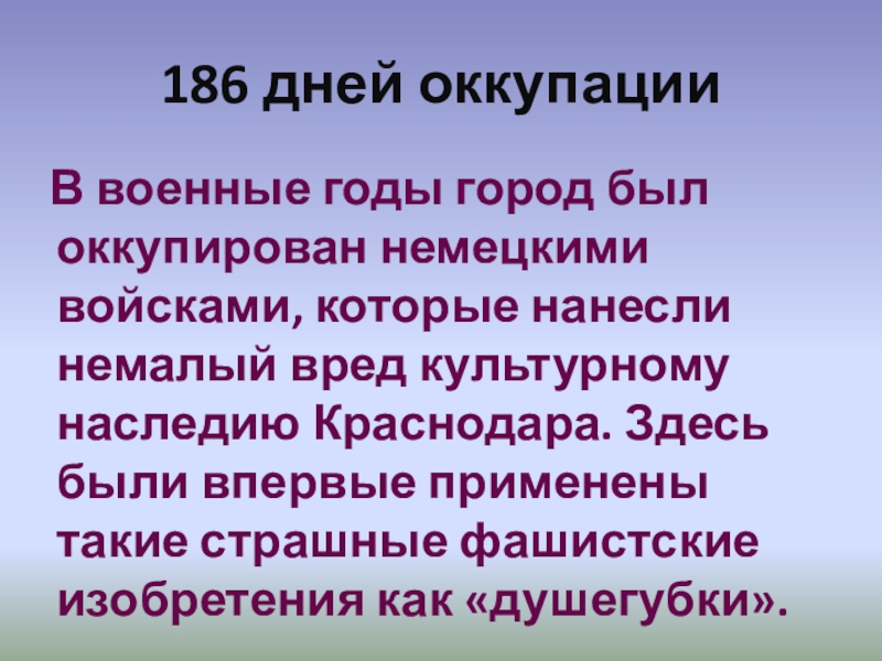 войсками, которые нанесли немалый вред культурному наследию Краснодара. Здесь были впервые применены такие страшные фашистские изобретения как «душегубки».