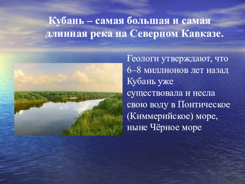 Геологи утверждают, что 6–8 миллионов лет назад Кубань уже существовала и несла свою воду в Понтическое (Киммерийское) море, ныне Чёрное море