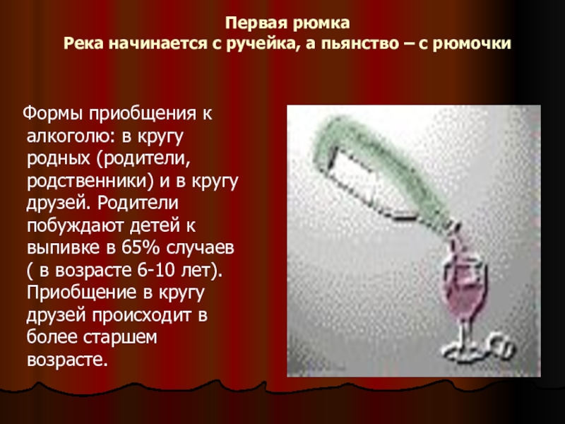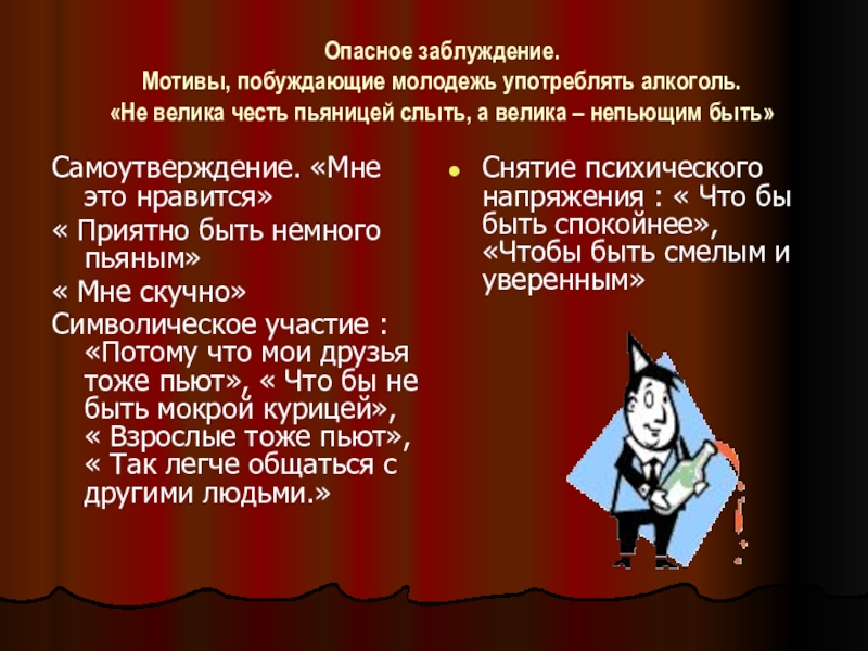 Символическое участие : «Потому что мои друзья тоже пьют», « Что бы не быть мокрой курицей», « Взрослые тоже пьют», « Так легче общаться с другими людьми.»