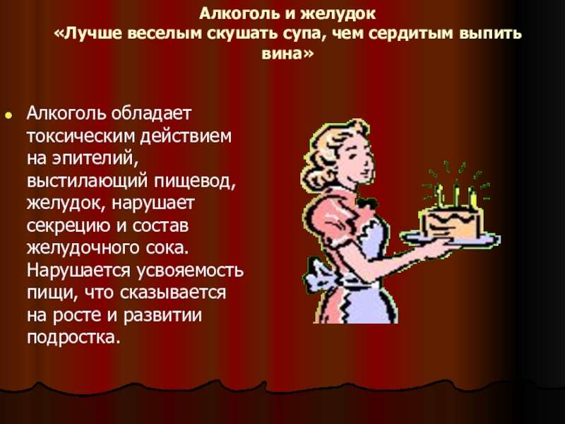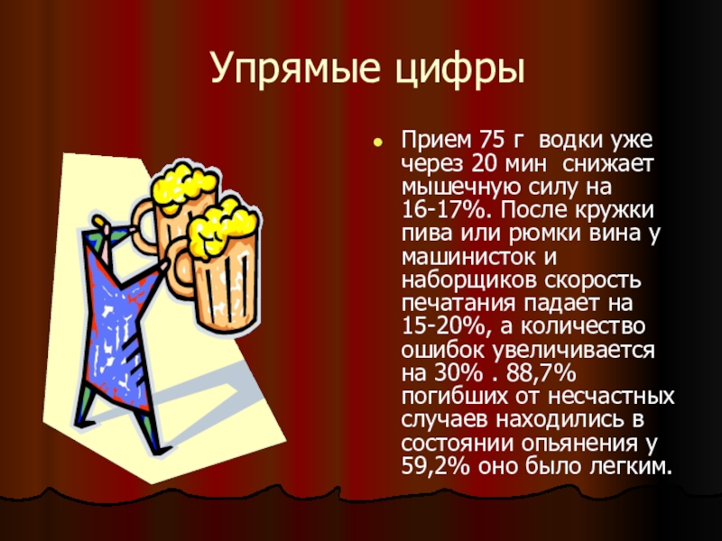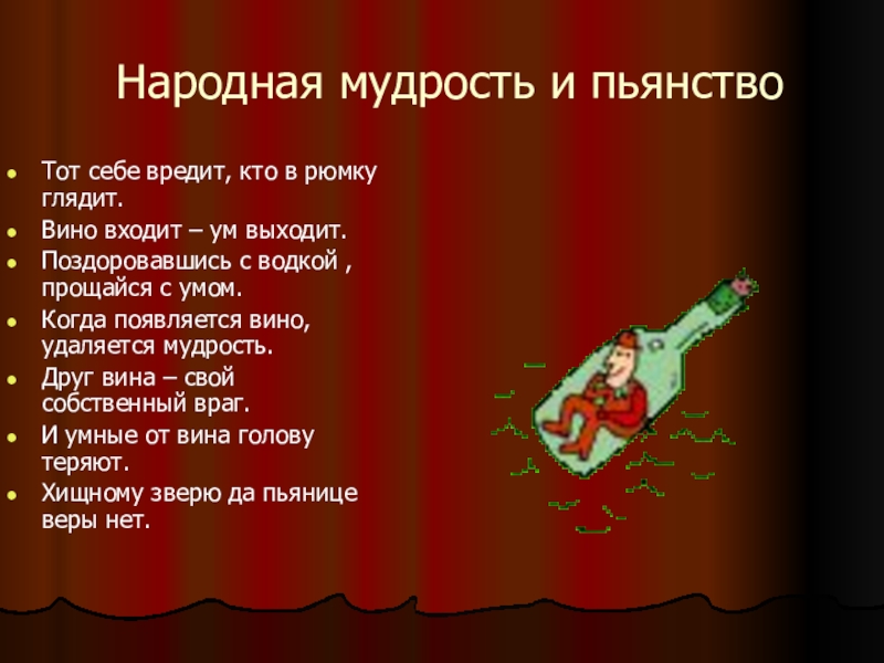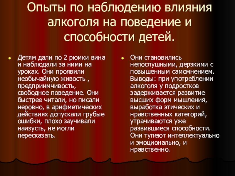 Они становились непослушными, дерзкими с повышенным самомнением. Выводы: при употреблении алкоголя у подростков задерживается развитие высших форм мышления, выработка этических и нравственных категорий, утрачиваются уже развившиеся способности. Они тупеют интеллектуально и эмоционально, и нравственно.