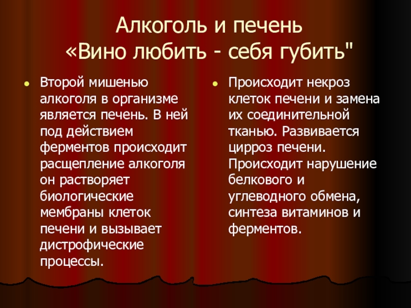 Происходит некроз клеток печени и замена их соединительной тканью. Развивается цирроз печени. Происходит нарушение белкового и углеводного обмена, синтеза витаминов и ферментов.