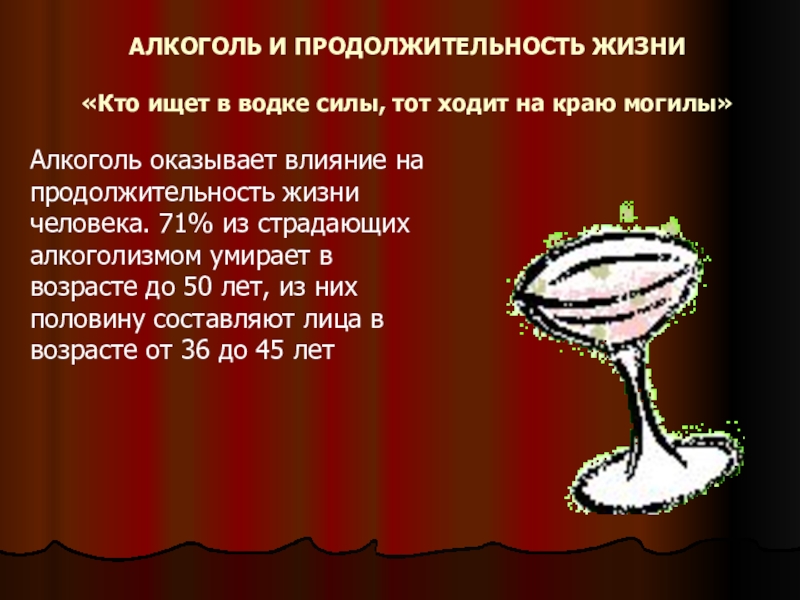 Алкоголь оказывает влияние на продолжительность жизни человека. 71% из страдающих алкоголизмом умирает в возрасте до 50 лет, из них половину составляют лица в возрасте от 36 до 45 лет