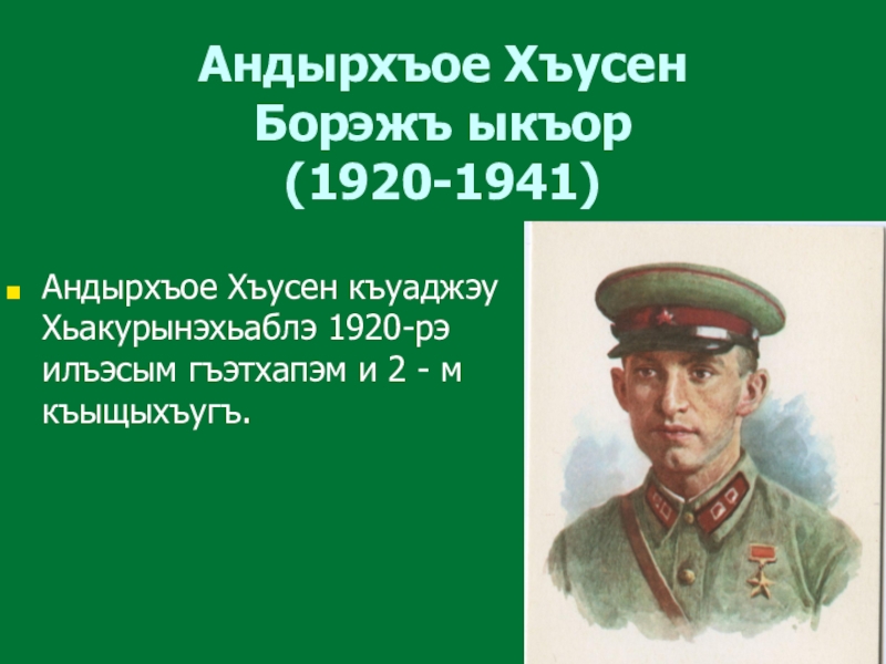 Андырхъое Хъусен Борэжъ ыкъор  (1920-1941) Андырхъое Хъусен къуаджэу Хьакурынэхьаблэ 1920-рэ илъэсым гъэтхапэм и 2 -