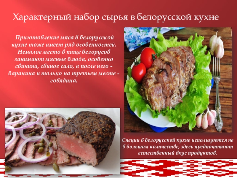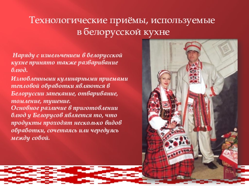 Излюбленными кулинарными приемами тепловой обработки являются в Белоруссии запекание, отваривание, томление, тушение.