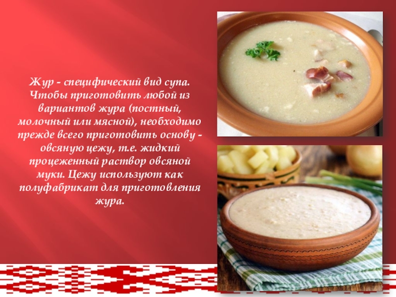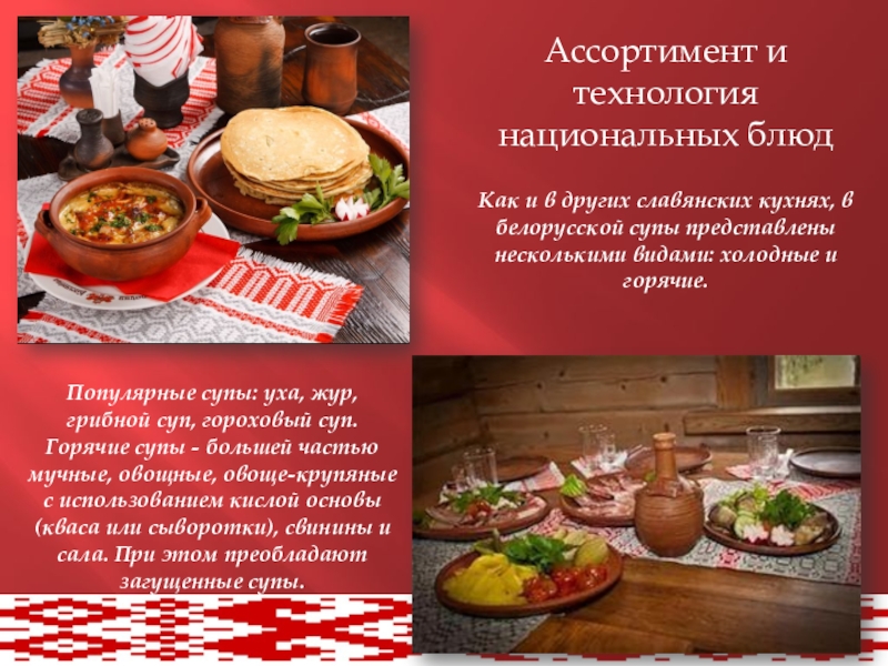 Популярные супы: уха, жур, грибной суп, гороховый суп. Горячие супы - большей частью мучные, овощные, овоще-крупяные с использованием кислой основы (кваса или сыворотки), свинины и сала. При этом преобладают загущенные супы.