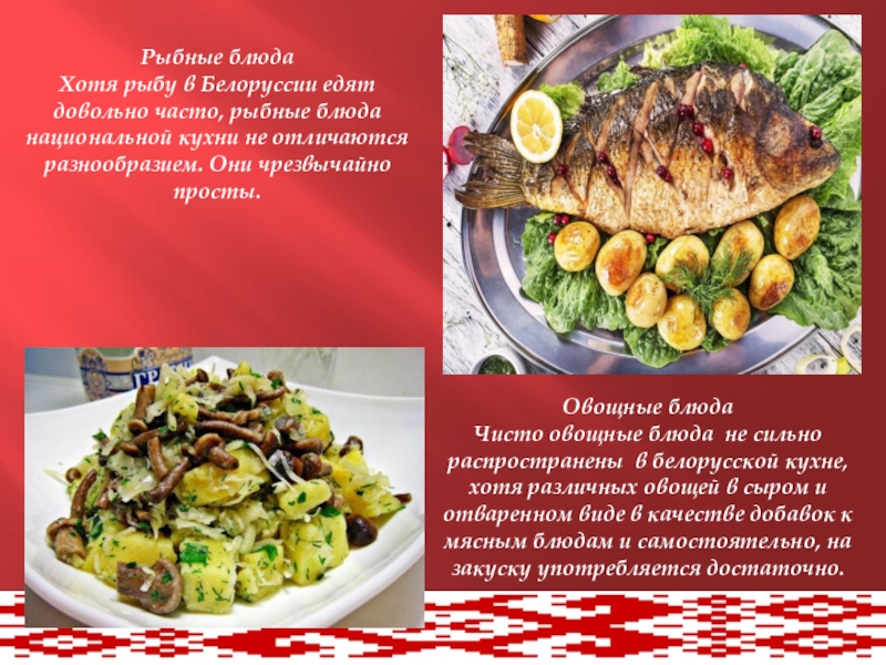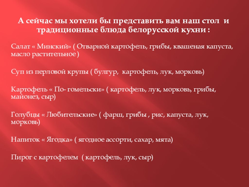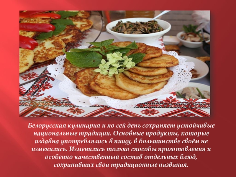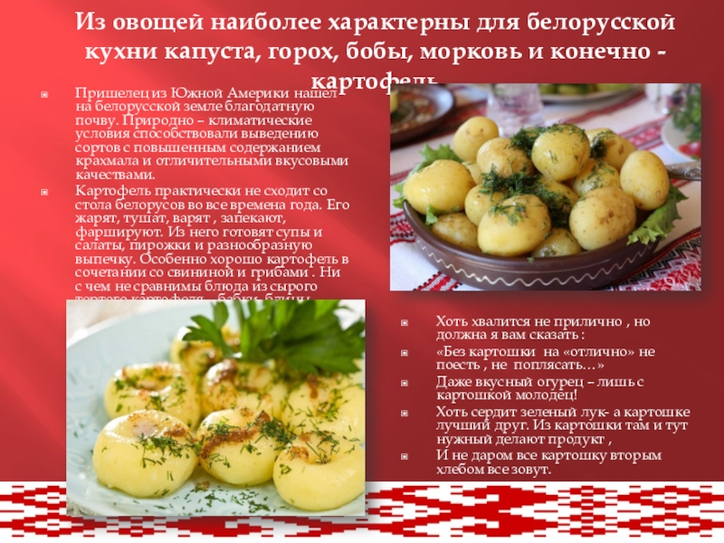Картофель практически не сходит со стола белорусов во все времена года. Его жарят, тушат, варят , запекают, фаршируют. Из него готовят супы и салаты, пирожки и разнообразную выпечку. Особенно хорошо картофель в сочетании со свининой и грибами . Ни с чем не сравнимы блюда из сырого тертого картофеля – бабки, блины, драники , клецки.