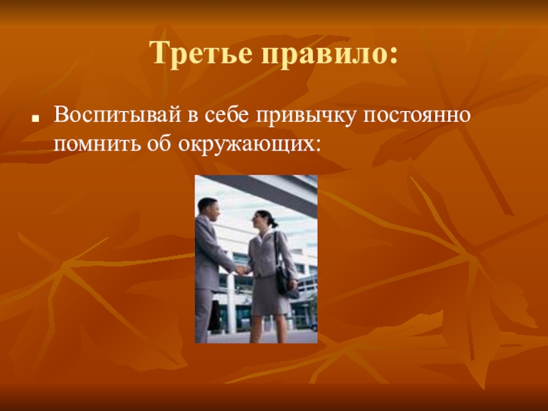 Третье правило:Воспитывай в себе привычку постоянно помнить об окружающих: