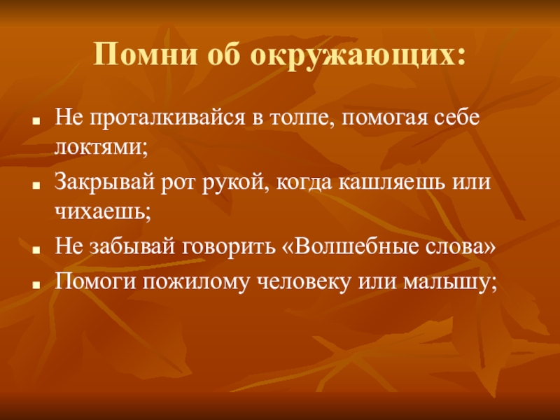 Помни об окружающих:Не проталкивайся в толпе, помогая себе локтями;Закрывай рот рукой, когда кашляешь или чихаешь;Не забывай говорить