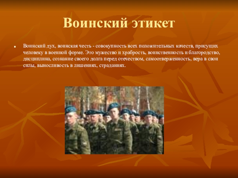 Воинский этикетВоинский дух, воинская честь - совокупность всех положительных качеств, присущих человеку в военной форме. Это мужество