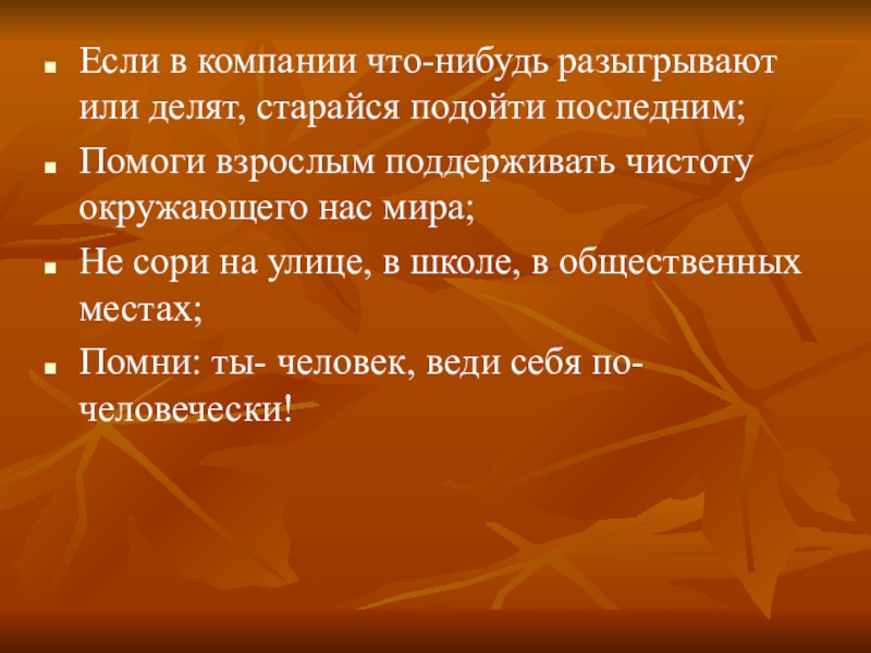Если в компании что-нибудь разыгрывают или делят, старайся подойти последним;Помоги взрослым поддерживать чистоту окружающего нас мира;Не сори